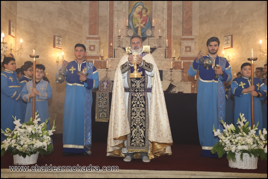 وجرى خلال القداس مباركة الخاجفار والهريسة من قبل أصحاب النيافة، وسط حضور واسع من المؤمنين، ورؤساء وأعضاء اللجان الإدارية لكنائس زاخو وأفزروك وهافريز والموصل، إضافة إلى مختاري القرى وأبناء الرعايا.